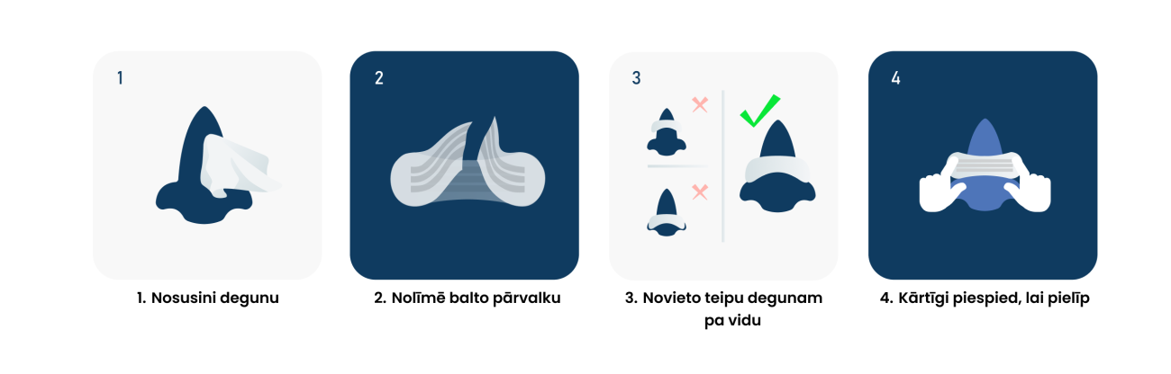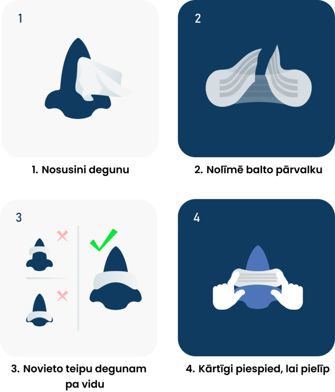 2. Noņem aizsargplēvi un novieto teipu deguna vidusdaļā