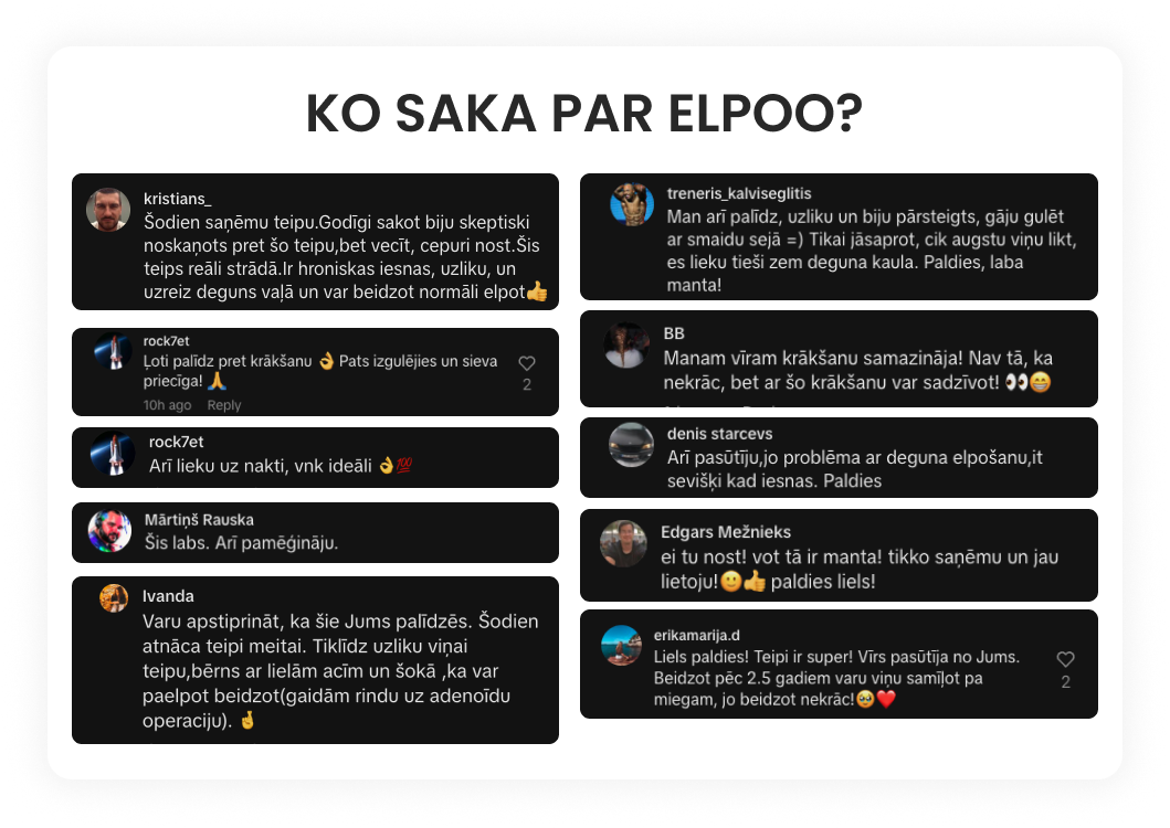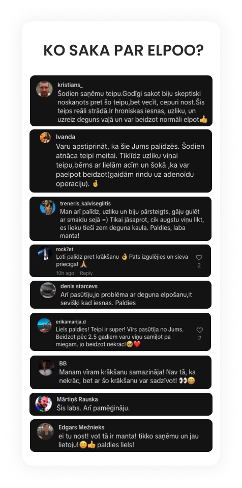 Iegādājos reklāmas iespaidā, taču šī ir tā reize, kad to nenožēloju. Esmu izmēģinājuši visādus līdzekļus, šobrīd Elpo plāksteri ir izrādījušies visefektīvākais.